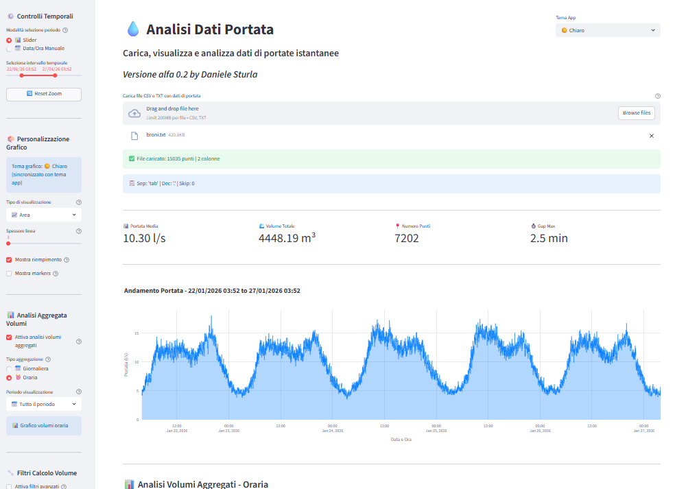 - Validazione Oraria: Il calcolo viene eseguito determinando la portata media per ogni singola ora. Se in un'ora non ci sono punti o ce ne sono troppo pochi (dati mancanti), l'app scarta quel lasso temporale per non falsare la media.