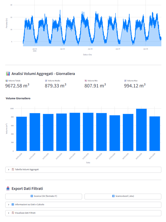 L'app genera automaticamente il grafico di queste portate nel tempo e ne calcola l'integrale per determinare il volume totale transitato. Invece di trascinare formule infinite su Excel, il sistema fa un piccolo calcolo numerico per restituire il volume totale in metricubi.