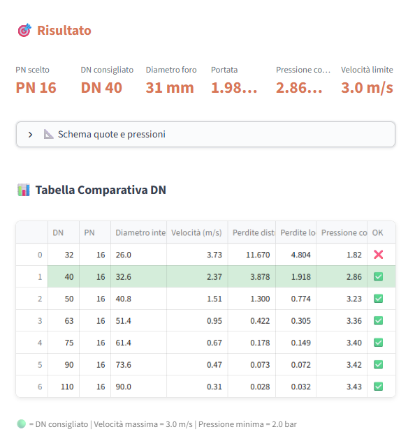 - Calcolo del Diametro Ottimale (DN): Una volta definita la portata e la pressione di partenza, il materiale scelto, la lunghezza dell'allaccio, l'app calcola il diametro necessario. Il calcolo non è approssimativo: considera sia le perdite distribuite (lungo la condotta) sia le perdite concentrate (valvole, curve, contatore). I sistema propone di default una configurazione standard. Il diametro viene scelto per garantire due condizioni fondamentali: il mantenimento di una pressione minima al contatore e il rispetto della velocità massima.
