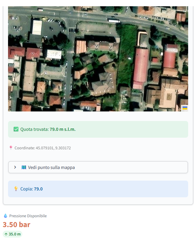 - Stima della Pressione di Rete: Il sistema genera un valore indicativo della pressione disponibile nel punto di stacco sulla rete stradale. Il calcolo sottrae alla quota piezometrica del serbatoio (o centrale) di riferimento sia la quota del terreno del nuovo allaccio, sia una stima statistica delle perdite di carico lungo la rete di distribuzione esistente (nelle condizioni di massimo consumo). La quota altimetrica viene acquisita in tempo reale interrogando dall'app i database geografici di OpenStreetMap , garantendo un dato preciso senza rilievi manuali. Poiché la pressione d'esercizio effettiva sulla rete stradale può subire variazioni dovute a logiche di rete o scenari di carico variabili, il software propone questo valore come base di calcolo, affidando al tecnico la validazione finale o l'inserimento di un dato da prendere in considerazione.