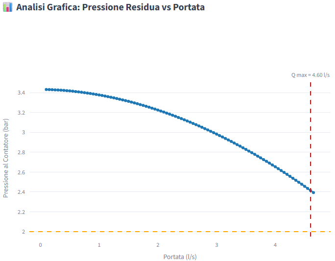 - Un grafico interattivo Pressione vs Portata: Il tool genera una "curva di prestazione" dell'allaccio tramite calcolo della portata massima erogabile al contatore con una determinata pressione residua.