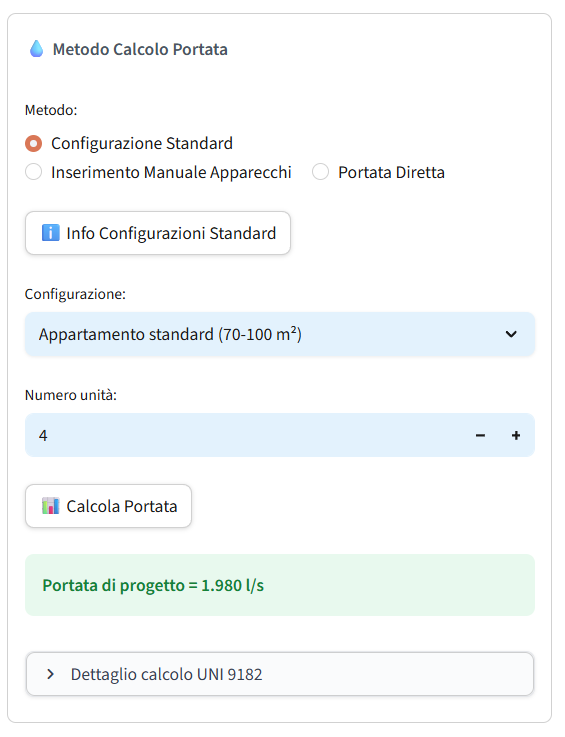 Nota Tecnica: L’app calcola la portata secondo la normativa mappando ogni punto di prelievo interno (lavabi, docce, WC, etc..) in specifiche unità di carico. Invece di procedere con una sommatoria lineare dei consumi nominali, il software applica una funzione di probabilità statistica alla sommatoria totale delle unità di carico per derivare la portata di progetto, definendo così il valore di picco statisticamente probabile dell’utenza. Sebbene il tool permetta l'inserimento analitico dei singoli apparecchi — procedura tipica dell'idraulico che dimensiona l'impianto interno — per massimizzare l'efficienza operativa nel dimensionamento degli allacci d'acquedotto ho standardizzato il processo attraverso template caratteristici (appartamento "piccolo", appartamento "grande", villa, ufficio, negozio, etc..) . Questi modelli preconfigurano automaticamente il mix di apparecchi in base alla destinazione d'uso, garantendo al contempo rigore tecnico e rapidità di input in un solo click. La UNI 9182 tende a una sovrastima per gli allacci, ma questa cautela garantisce che l'allaccio regga i picchi di consumo senza cali di pressione. È possibile anche inserire portate fisse.
